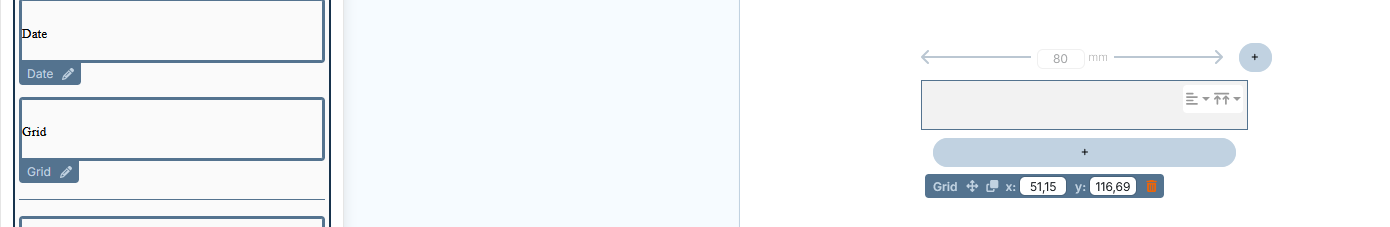 When the grid is located in the header or footer area (and not on a title page), column widths can be defined either in millimeters or proportionally. To switch from one to the other, use the button: