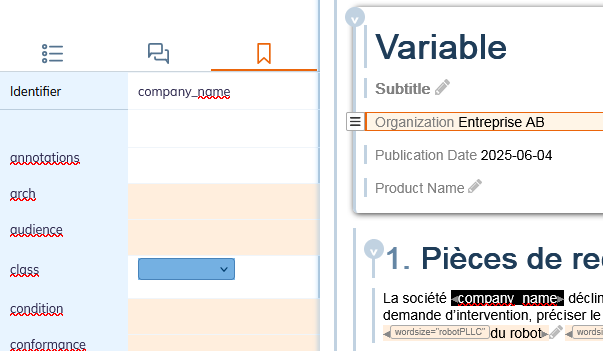 Specify an identifier (see To identify) on the element that contains the text to be reused. It is often an element of the block “information” of the document such as a product name, organization, version number, etc.
