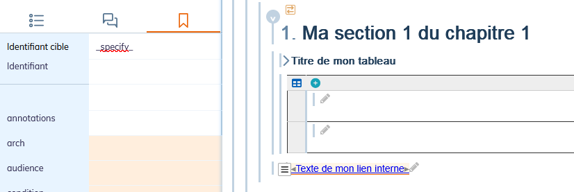 Select the item Internal link. In the list of attributes, replace "_specify_" by the identifier given to the target element: